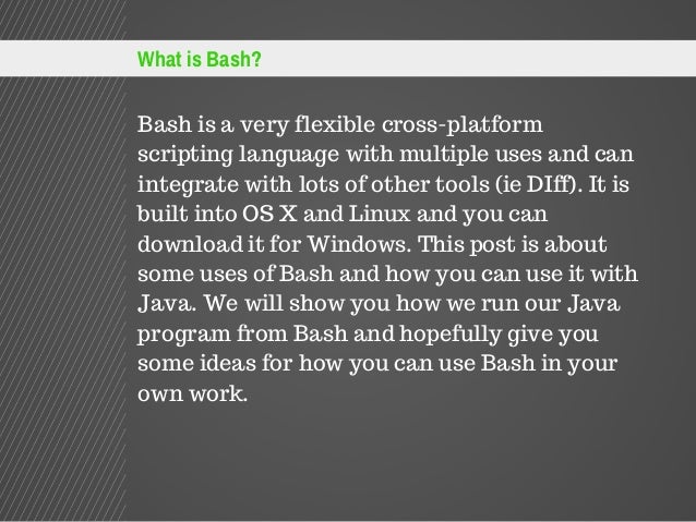 Shell (bash) programs are written for exactly the same reasons programs are written in other typically, shell programs are used when it is desired to use other existing programs to do the heavy. Bash is a type of interpreter that processes shell commands. Bash is a command processor, typically run in a text window, allowing the user to type commands which cause actions.